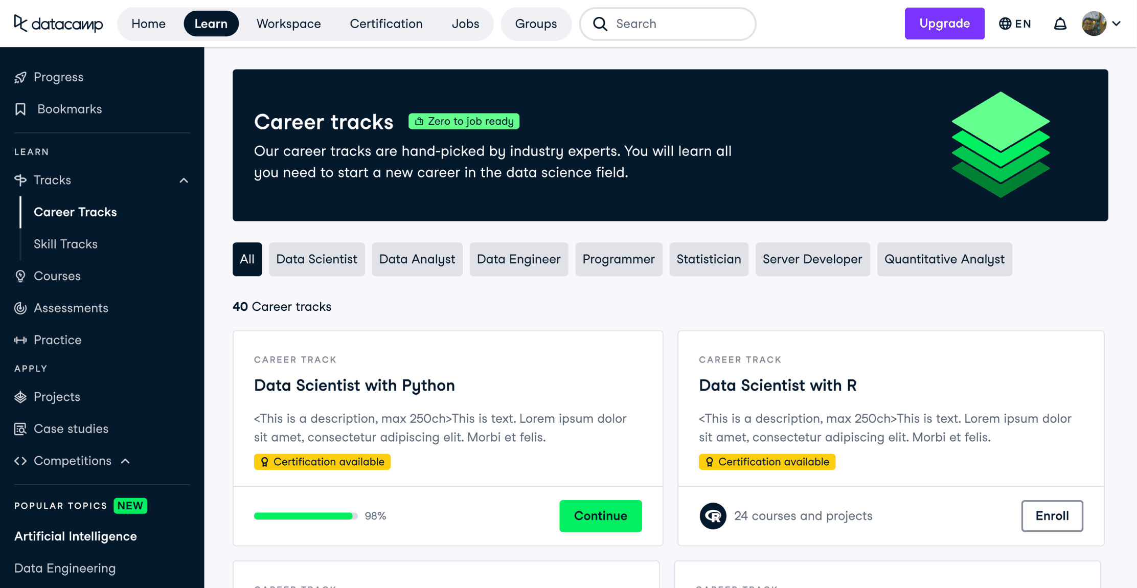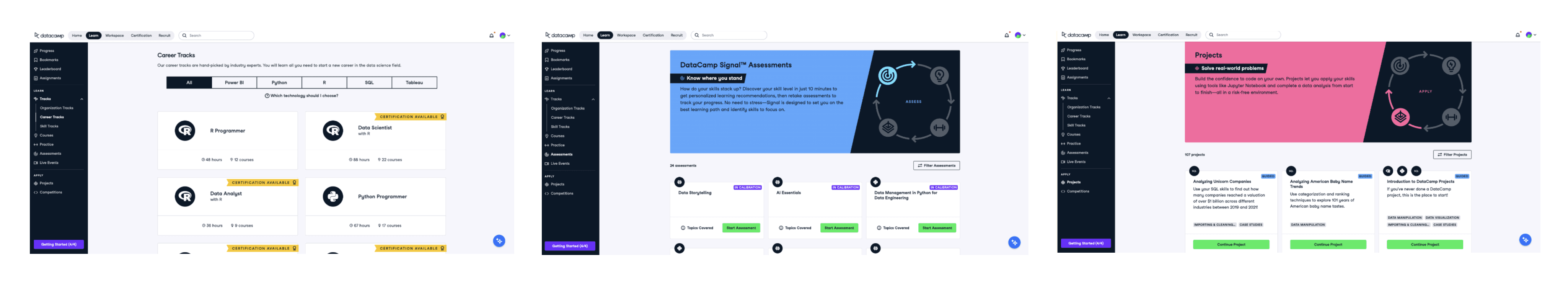 Datacamp has a vast variety of educational and interactive content on data science which are organized in ALPA loop: Assess > Learn > Practice > Apply. From individual courses and complete career tracks, to short practice sessions and portfolio projects – more than a thousand learning opportunities in different formats are open to Datacamp learners.
