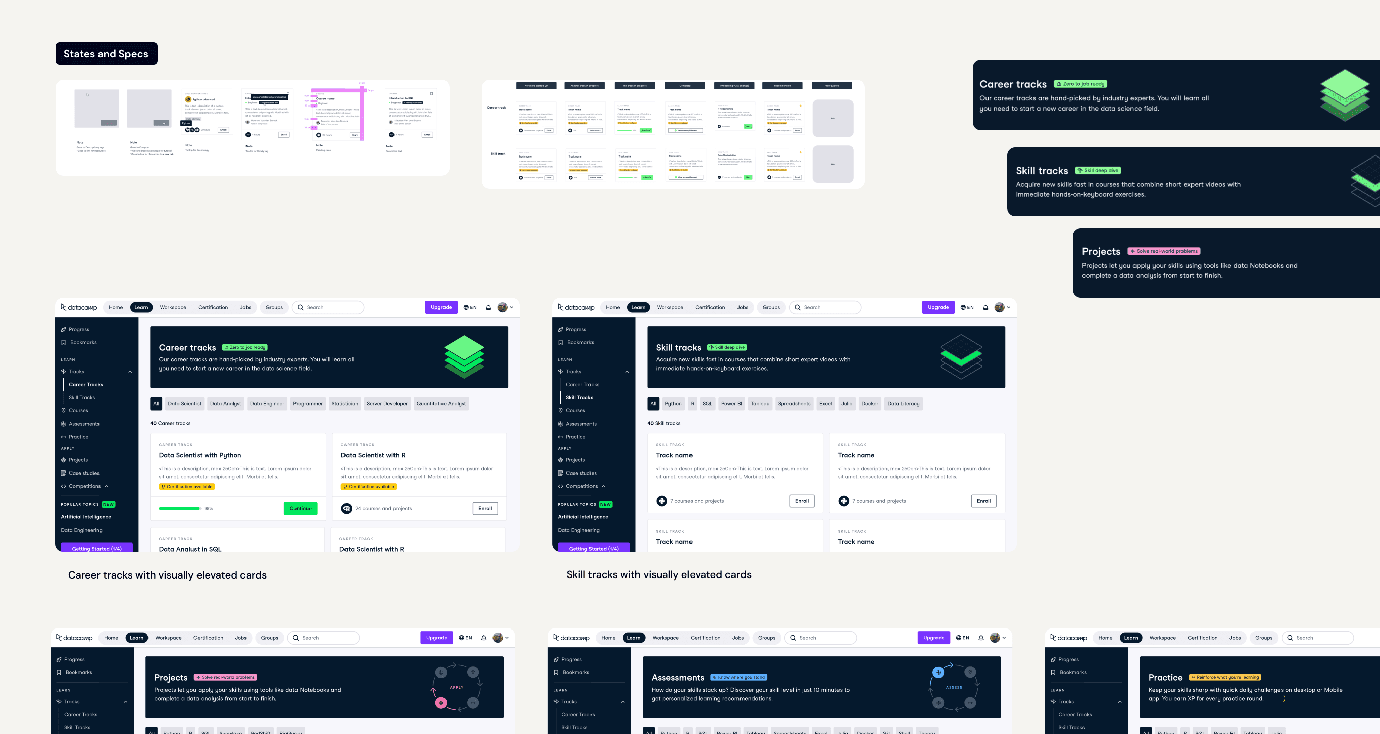 New cards with unified layout that slightly varied depending on type of content: for example, Career and Skill tracks were placed in a 2-column grid to make them visually stand out since taking a track is a big commitment, and Projects were given a visual to make it closer to the real world just like the purpose of practicing on real-world problems