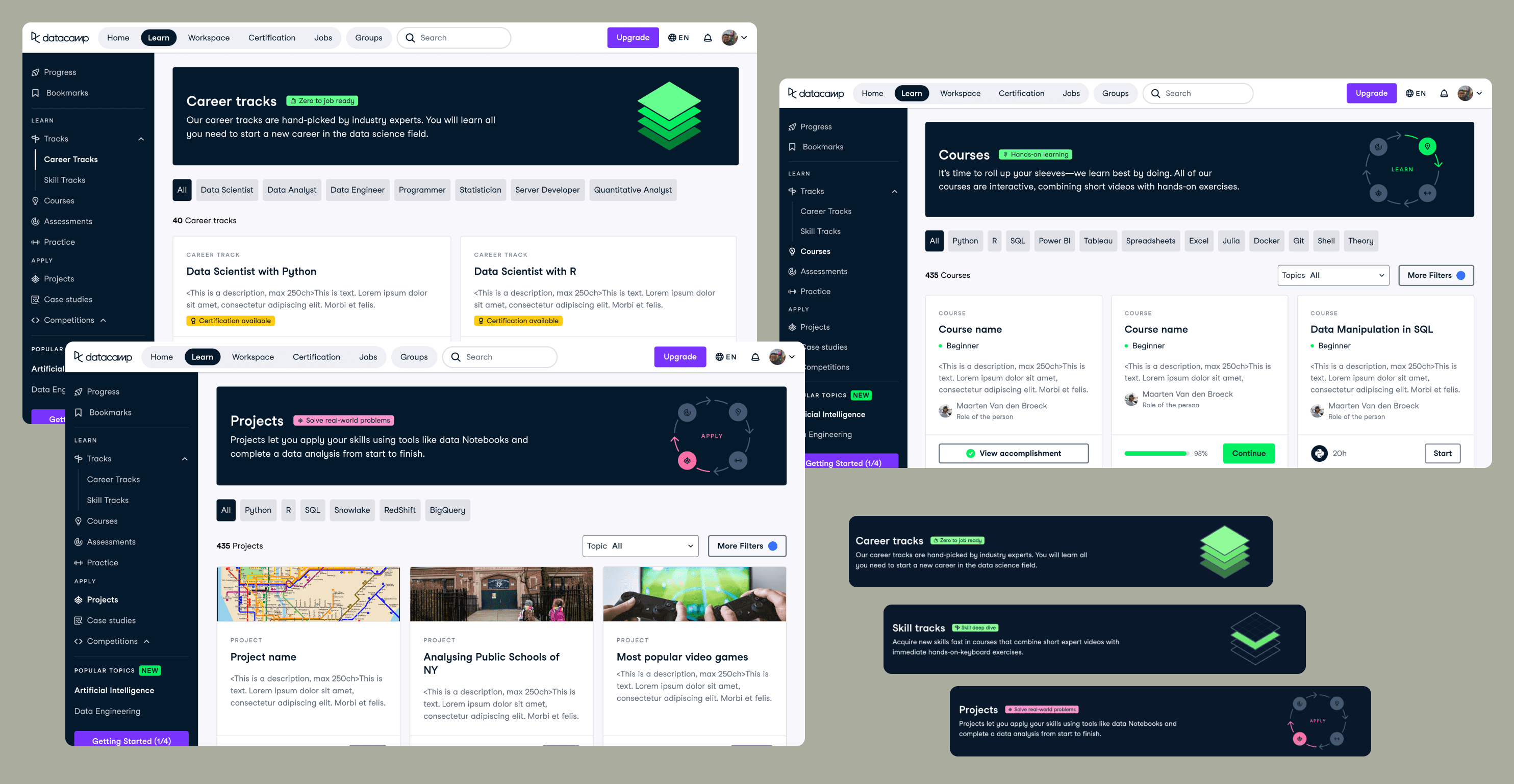 All pages of the redesign: Career and Skill tracks, Courses, Projects and so on
