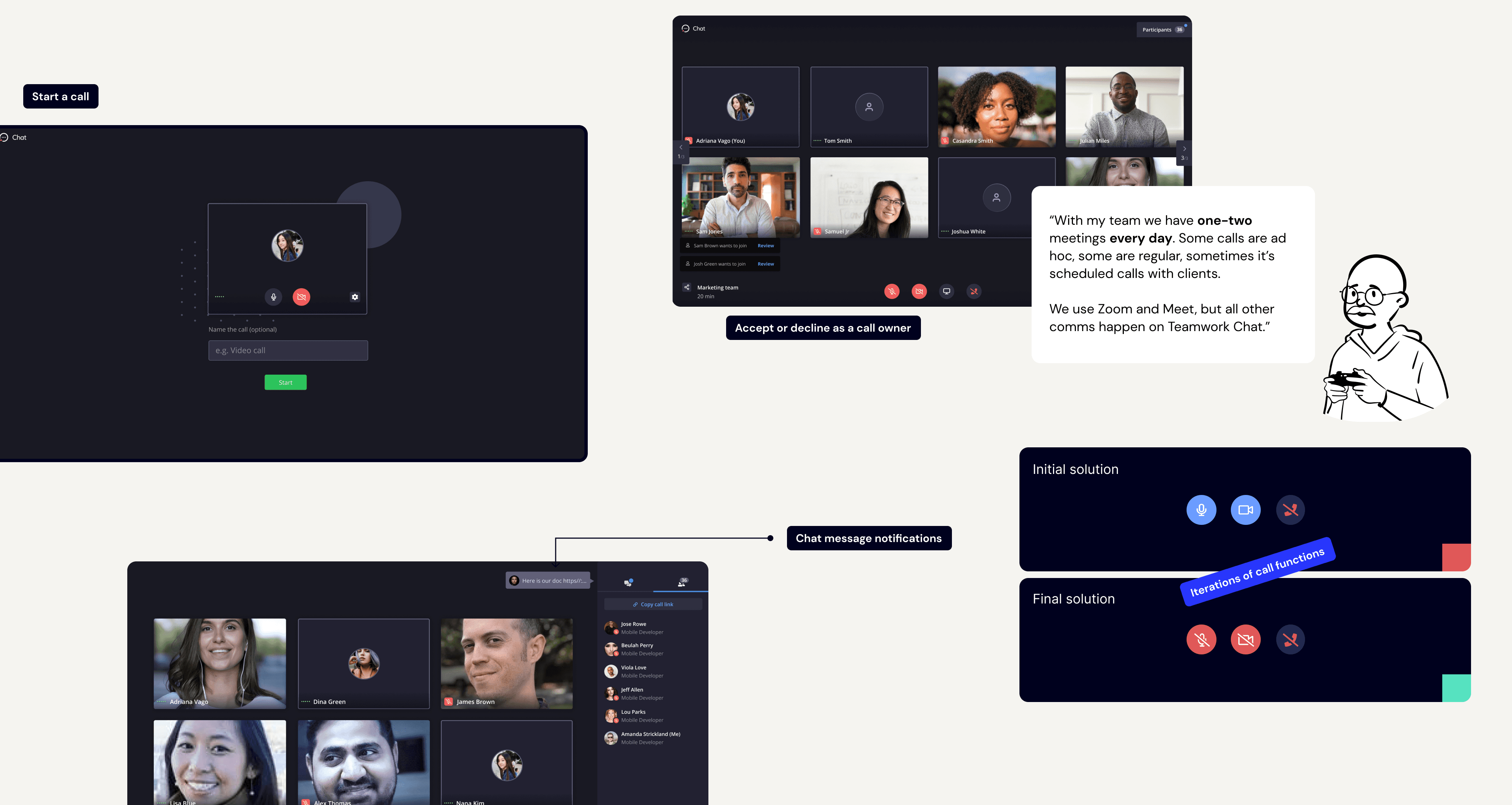 The first iteration was framed as an add-on for quick calls. Out of thousands of users of Teamwork Chat around 28% would use calls daily, and 50% would use it weekly. It later became a paid add-on for Teamwork Chat.
