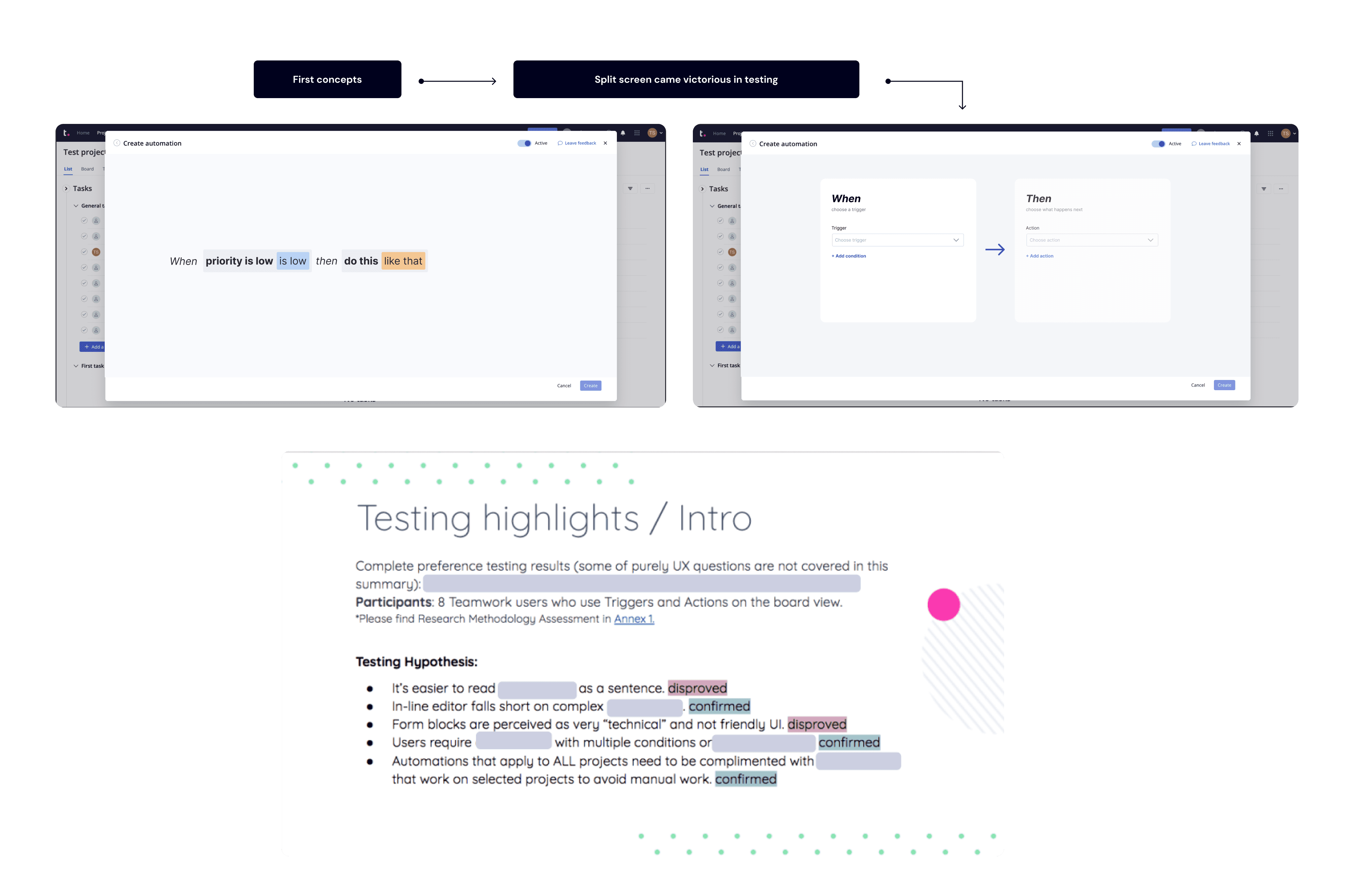 First we tested two major concepts: inline (or sentence like approach) and split screen with clear When and Then fields. Split screen emerged as a winner.