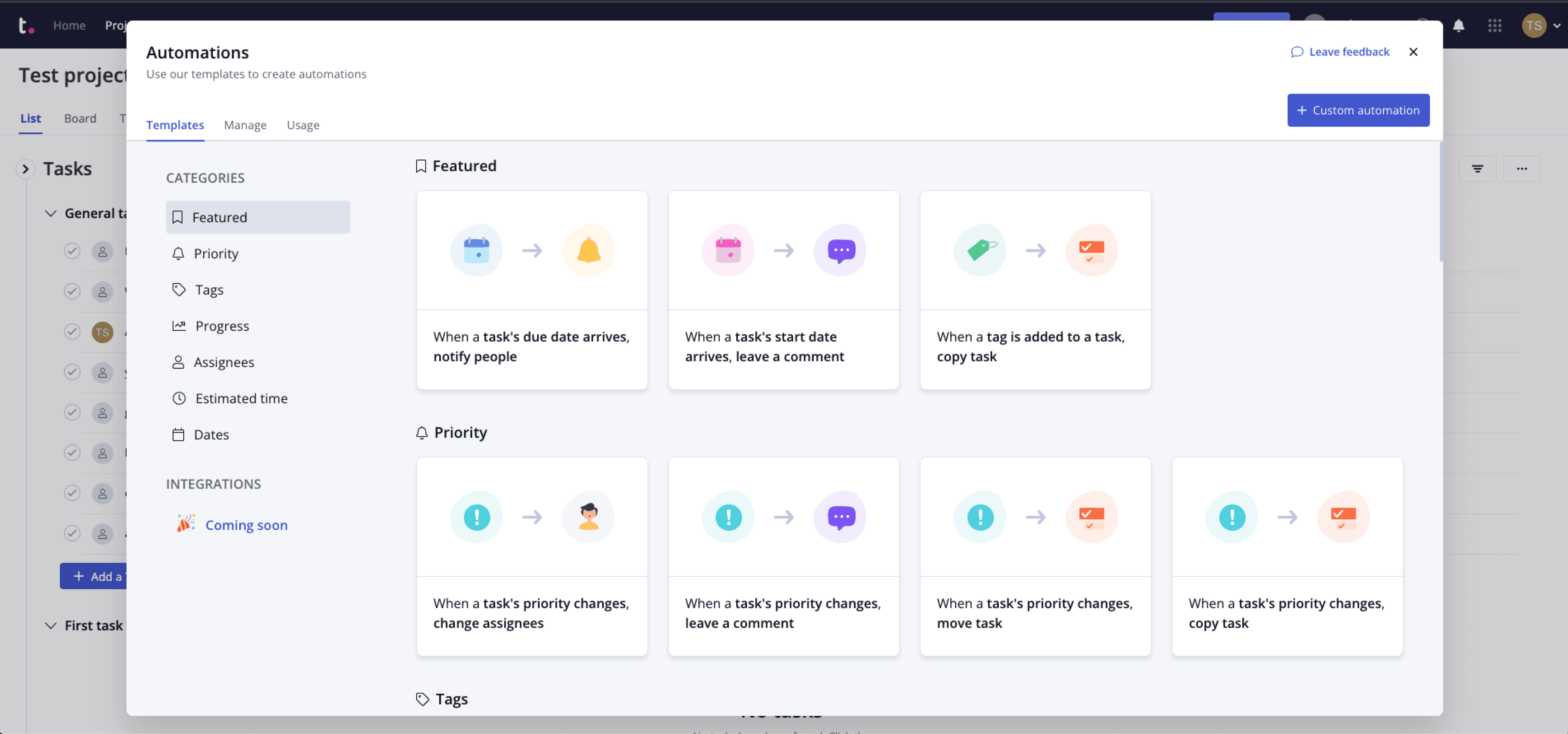 Many desk professionals waste time on manual tasks (e.g., tagging managers on blocked tasks, adjusting categories depending on the state of a ticket). As told by users of Teamwork, they would even abandon us for platforms that can handle it.